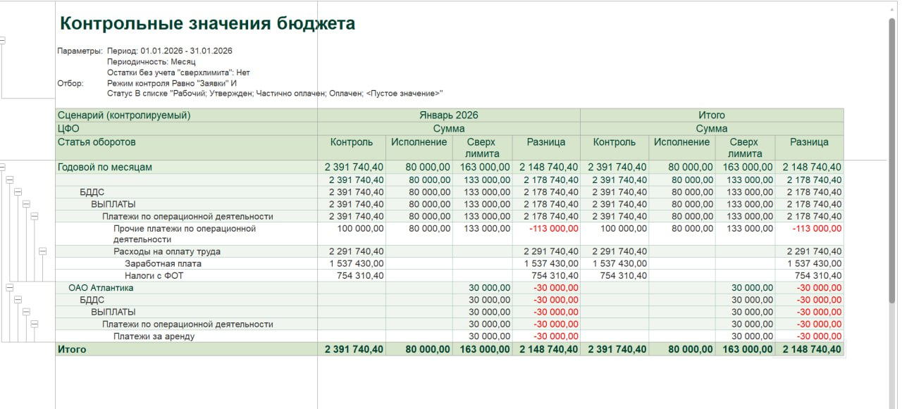 - Иерархия по статьям БДДС («Операционная деятельность» → «Прочие платежи» и т.д.) позволяет быстро найти проблемную зону.