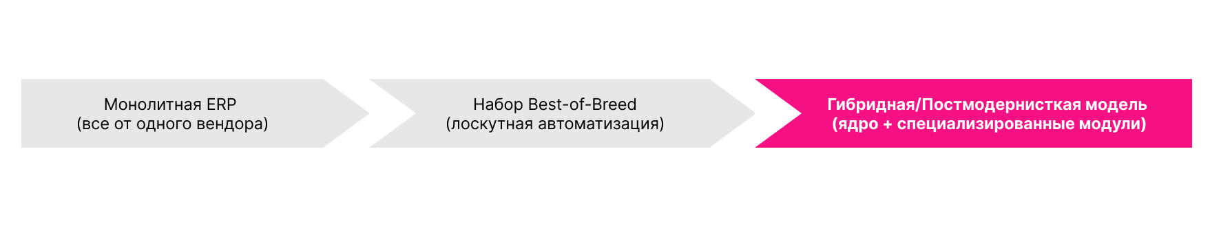 Мировая практика уже несколько лет как выработала ответ на эти вызовы — «постмодернистский ERP». Это не конкретный продукт, а архитектурная философия. Ее суть — отказ от поиска идеального «универсального солдата» в пользу сборки оптимального комплекта: надежное ядро для базовых и стандартизированных процессов + лучшие в своем классе (Best-of-Breed) решения для критически важных функций.